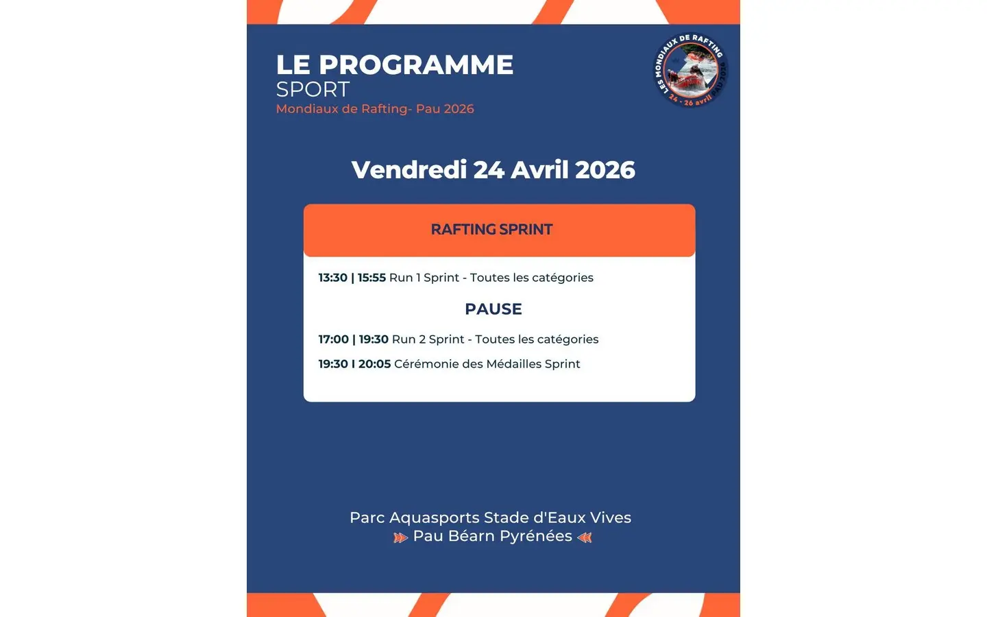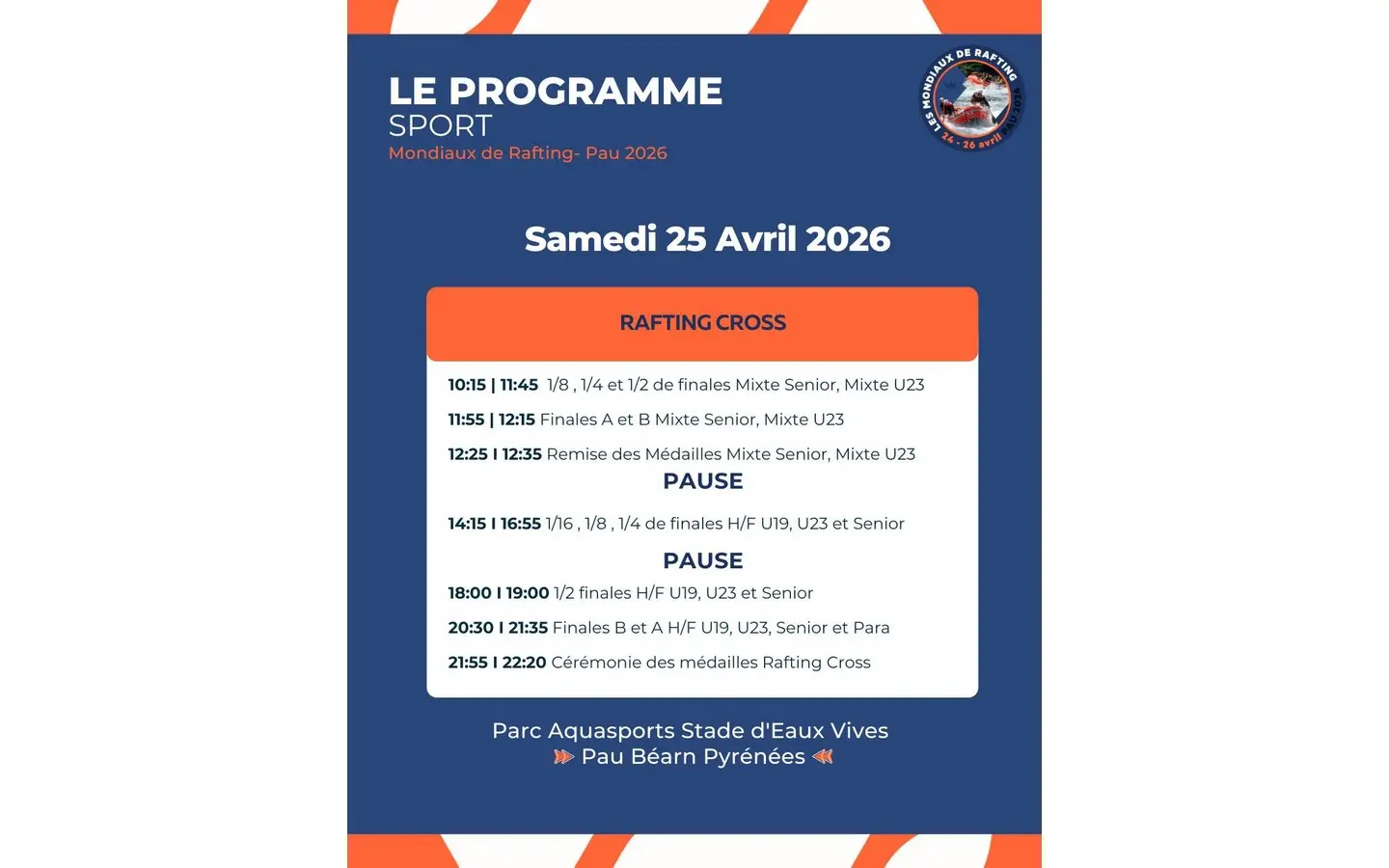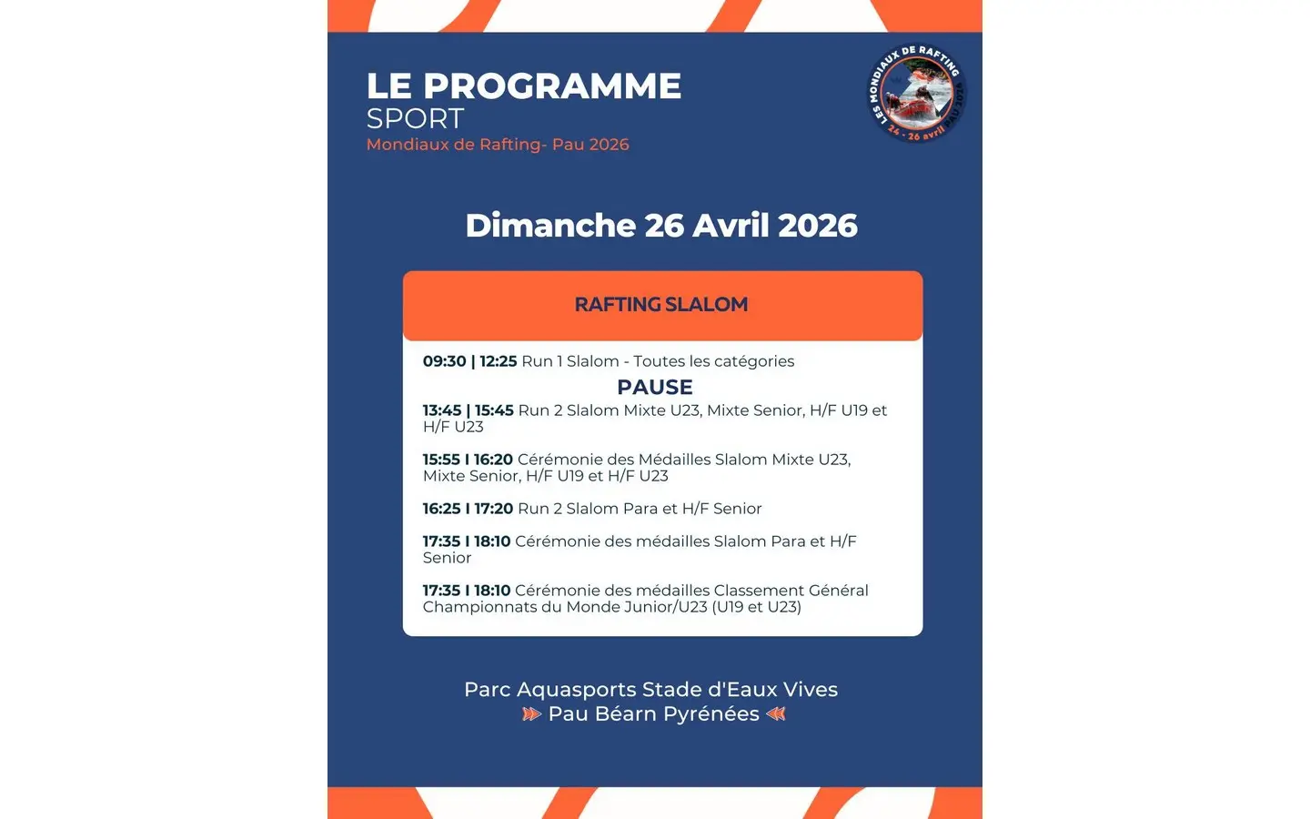 Pour la première fois, Pau va accueillir les Championnats du Monde Junior/U23 et la Coupe du Monde Senior de Rafting au Parc Aquasports, Stade d’Eaux Vives - Pau Pyrénées du 24 au 26 avril.